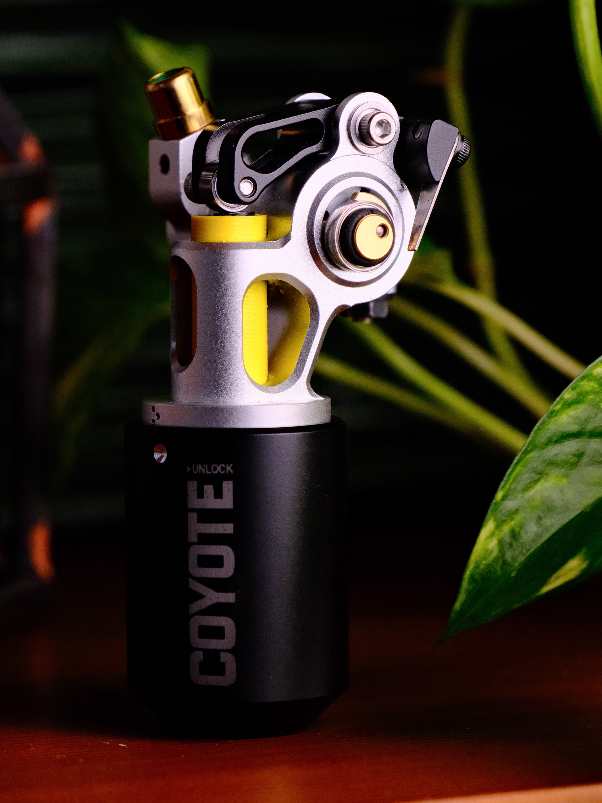 Mother Coyote combines the strength of a coil with the comfort of a pen. A long, decisive stroke, aluminum body, and unique grip system make it a powerful choice for experienced tattoo artists seeking precision and impact.